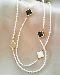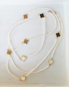 春の雰囲気ぴったりの4花弁チャームをちりばめた細シルエットのロングネックレスが誕生♪ ホワイトのベビーパールと、花弁チャームはホワイト・ベージュ・スケルトンオリーブブラウンの落ち着いた3カラーのバランスが大人♪お写真では黒っぽく見えていますが、光を通すと透き通るオリーブブラウンなので軽やかなカラーグラデーションを楽しんでいただけます♪全長128センチとロングなのでワンピースとのコンビネーションが抜群♪スタイルUP間違いなし♪