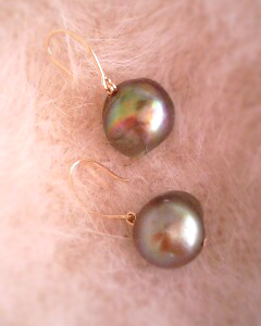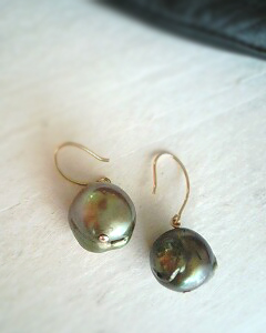 衝撃の登場から私たちの心を奪い続ける大粒タヒチアンパールのシリーズに、シンプルなフックピアスが仲間入 りしました♪ 目立たない部分にえくぼやキズがあるので新作ながらSALE価格でのご提供です。 光源の加減でゴールドに輝いたり、グリーンに輝いたりと多彩な表情で私たちを楽しませてくれます♪