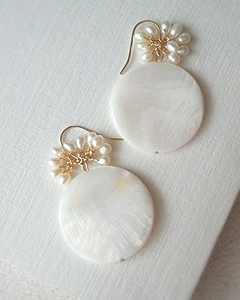 海の唄がきこえる“ocean story”シリーズ♪ 30mmの大振りのコインシェルは波打ち際の白い砂浜のような波紋模様が涼を誘います♪ 付けるとどの角度からでもポロポロと可愛く揺れるよう3×4mm、合計20粒もの淡水パールで 岩に砕ける泡を表現してみました♪白とゴールドの組み合わせなので 幅広いファッションに併せやすいデザインです♪